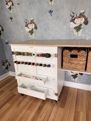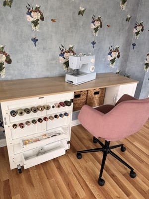 I was honestly so impressed once this was set up. It’s even prettier in person than I expected, and it instantly made my sewing space feel more put together. I love how much storage it has. There’s a place for everything, and the little pegs for thread are one of my favorite details because I can actually see all my colors at once. It also folds down so everything tucks away, which makes such a difference in keeping the room from feeling cluttered. The setup process was really straightforward and the instructions were easy to follow. It did take me a couple of hours, but I tend to move a little slower with things like this, and I had no issues putting it together. I literally couldn’t wait to start filling it up with all my sewing notions. It’s such a good mix of being really functional while still looking beautiful in the space.