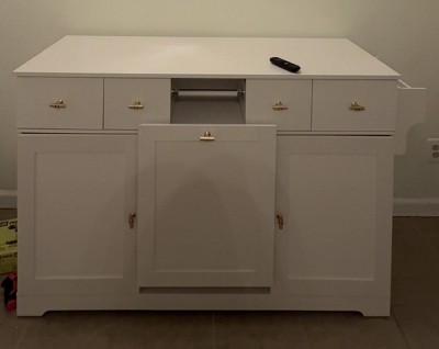 Kitchen Island With Double Tilt Out Trash Can Storage Cabinet & Drop Leaf Large Rolling With Power Outlets Hidden 10 Gallon Garbage Bin Storage