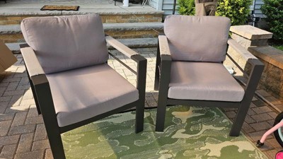 [This review was collected as part of a promotion.] What a great set of patio chairs! They were easy to assemble, and I was really impressed with how thick and supportive the bottom cushion was! The back cushion leaves a bit to be desired, and I'll probably have to buy a couple more pillows to make them more comfy. Overall, I'm really happy with these chairs!