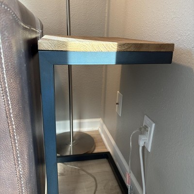 • A: The side table features an industrial style with a combination of wood and a powder-coated iron frame.