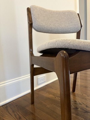 These match my walnut table perfectly. Can't beat the price, and for real wood chairs! Easy enough to assemble for one person. Firm seat is quite comfortable. The back is a perfect height for comfort, providing a little hug for your back. The fabric is more of a warm gray. I see hints of brown, making them versitile. Not sure how they'll hold up with littles and spills. But at this price, I'm not worried whatsoever. They can easily be reupholstered if you prefer a different fabric but what it comes with is nice. I plan to spray the fabric with protectant just in case.