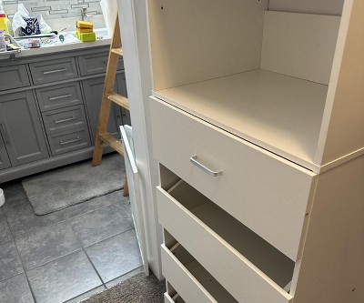 Sturdy and good quality. Two things however there are no white covers for the steel screws which show in our closet plus the “metal” drawer handle is very light and cheap looking. I will go and buy/replace these items at Lowes. Otherwise it would be a 5 star