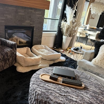 Great cozy rug for the price! Big rugs are so expensive and this was a good price. We have dogs so it perfect!