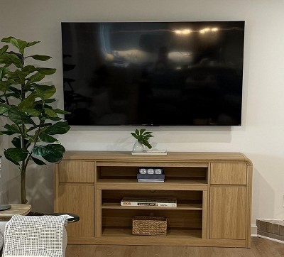 The tv stand features 2 Drawers, 2 Doors, and 3 Open Shelves, offering ample space to organize your media devices, books, remotes, and more. The spacious top surface (70 in. x 15.6 in.) can comfortably hold large TVs and decorative items, with a tabletop maximum weight capacity of 100 Lbs and each drawer supporting up to 20 Lbs. Say goodbye to tangled wires too¡ªthere are 5 built-in cable holes to keep your setup neat and organized.