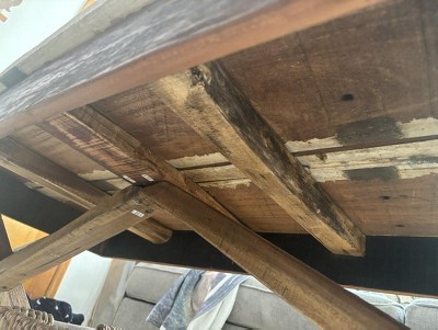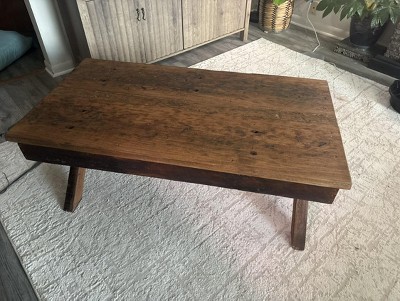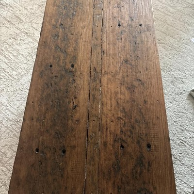 Wow solid reclaimed wood. I love the look. But can be expensive. This is very reasonably priced. Underneath I can see paint from its previous life. I did polish it with an expensive wood polish. Not the cheap Pledge stuff. The color came back to a nice brownish red. It is very heavy.