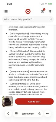 • 【Durable PU Leather】Rocking chair is crafted from high-quality PU leather, this recliner combines a sleek look with easy maintenance, it’s easy to wipe, the chair's backrest and seat are highly resilient, maintaining shape even after prolonged use.