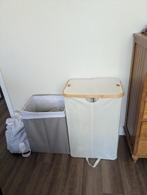 Laundry Hamper with 2 Lids, 39 Gal Dual Compartment Basket with Removable Liners, for Laundry Room Bedroom Living Room, Slate Gray & Bamboo