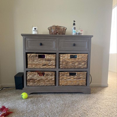 This furniture piece is a stylish and functional addition to any room, offering ample storage while being lightweight and easy to move. Guests appreciate its preassembled design, making it convenient to use right out of the box. However, some have noted concerns about the quality of the baskets, which may not hold up over time. Overall, it serves well for various purposes, from a coffee station to a bathroom organizer.