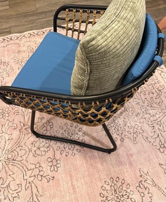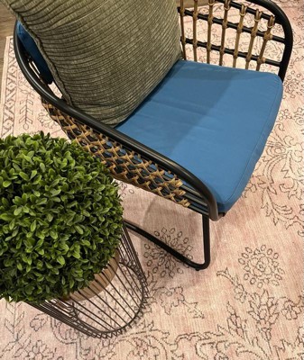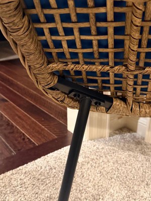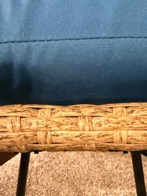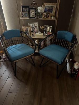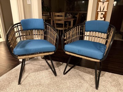 [This review was collected as part of a promotion.] I LOVE these patio chairs! I previously had two wood folding chairs on my patio, and they were looking rough. The wood was sunbleached, and the chairs were hard and uncomfortable. These chairs— their replacements— are such an upgrade. The metal frame is built to withstand the weather, and the navy color is both elegant and modern. I love the bright pop of color of the turquoise cushions, and the wicker-like webbing makes the chair sturdy yet comfortable enough to sit out and enjoy the patio. The rear back cushion hits in the perfect spot on my lower back to provide support. Love love love!