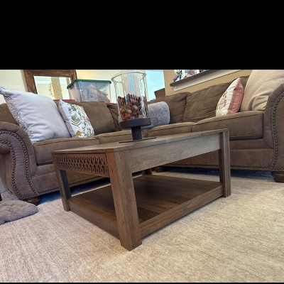 Galano Square Coffee Table with Cutout Drawer Storage in Knotty Oak 31.5" W × 31.5" D × 16.3" H