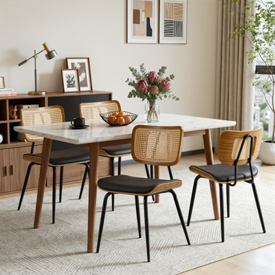 Bekrvio Set of 4 Mid Century Modern Dining Chairs with Wood Legs, Rattan Back, Faux Leather Kitchen Chairs, Black