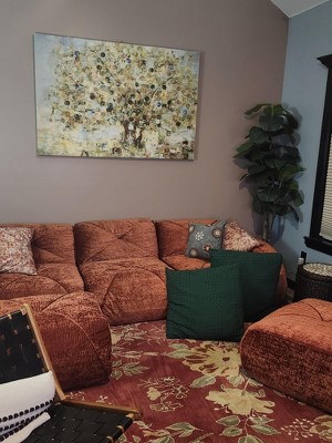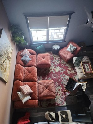 The modules came vacuum sealed in individual boxes. My teen granddaughter and I (69) easily carried them upstairs and unbound them. They expanded right away and were fully "puffed" and firm in 24 hours (they say 72 hours). This sofa was an incredible surprise! It is spectacular! The brown-red is gorgeous. The red is like a brick red with orange undertones. It's super comfortable. The fabric is very soft and luxurious. I got the 4-seater with 2 ottomans. I set it up as a 3-seater with a separate chair. In my opinion, its best suited for a den or informal room. Very sturdy and supportive.