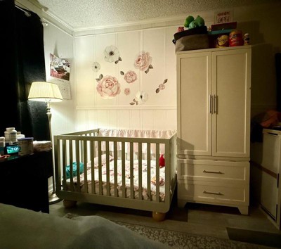 We have the Storkcraft Amalfi crib in the olive/driftwood colour and it’s honestly our favourite nursery purchase ever. The olive is soft, earthy green that feels calm and elevated, and the driftwood tone adds warmth so it pairs beautifully with with pretty much any neutral decor. It looks far more designer in person than I expected for the price point, and it feels sturdy and extremely well made once assembled. I also love that it’s a 5 in 1 convertible crib and comes with the toddler guardrail, so it feels like something we’ll use for years rather than a short term baby item. Assembly was very straightforward and overall it just feels like a thoughtfully designed, high quality crib that makes the room look pulled together.