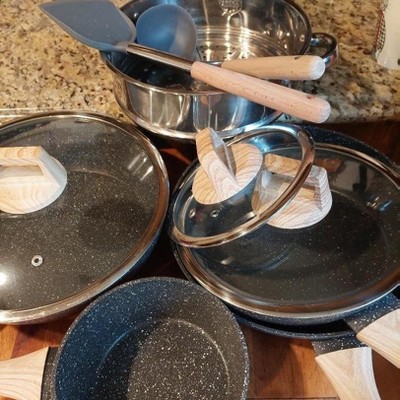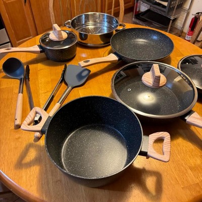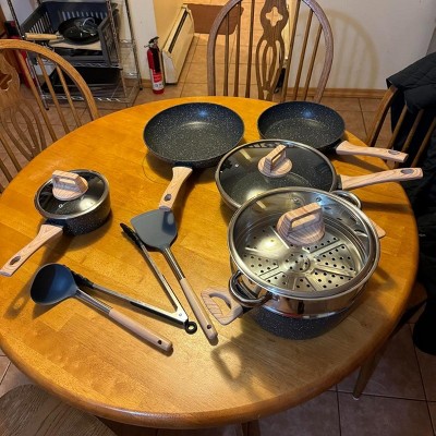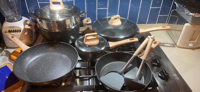 I’m very happy with this cookware set. The pots and pans feel sturdy, heat evenly, and are very easy to clean. The non-stick coating works great, and food doesn’t stick at all. It includes a good variety of sizes, which makes it perfect for everyday cooking. Overall, it’s an excellent value for the price and a great addition to any kitchen. I would definitely recommend it.