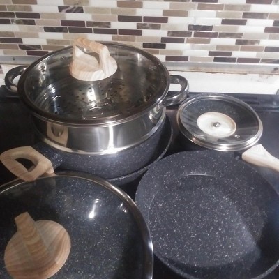 I am moving into the new house, so I wanted to buy a new cookware set, mine old pans are still look fine, but food always sticking on them. This beautiful set came very well packed, no scratches. As for now I only tried little frying pan, and it works amazing! Eggs are sliding and not overfriyed! Very happy and will try other things!
