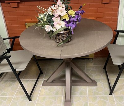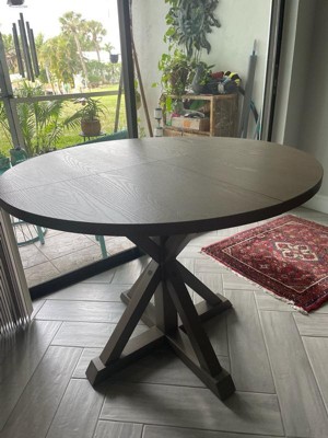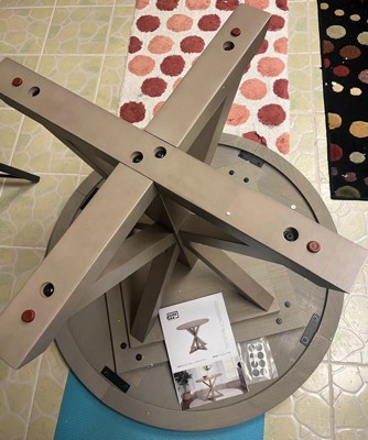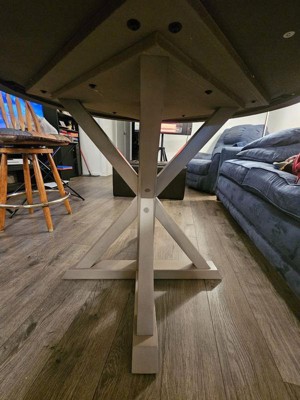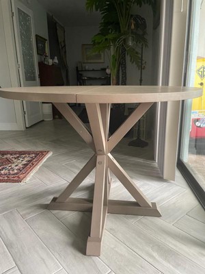 [This review was collected as part of a promotion.] So far, I am very pleased with this table! The color is a very deep beige color but could also take on a grey color. I am happy it is dark enough that it is not grey for my space. The deep color makes it look very rich and the finish seems like it will hold up really well. I love the farmhouse, French country vibes I am getting from the base of the table also. This table will work well as a dining table in my small dining space.