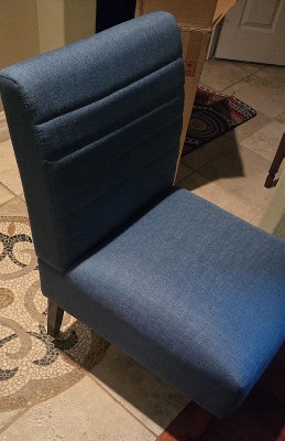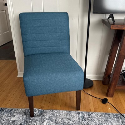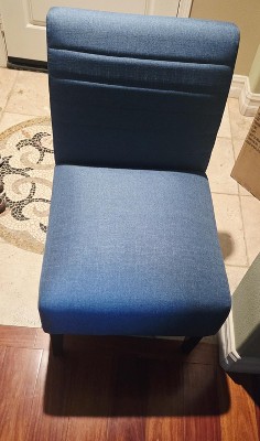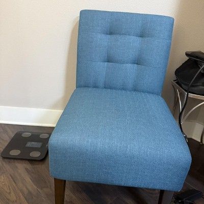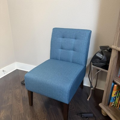 Really happy with this chair and honestly didn’t expect to like it this much. The blue color looks even better in person and adds a nice pop without being too loud. It fits perfectly in my room and doesn’t take up much space, which I appreciate. The fabric feels soft and comfortable, and the tufted design gives it a clean, modern look without feeling overdone. The armless style makes it super versatile—I’ve used it in the living room and also at my makeup vanity, and it works great in both spots. It’s comfortable enough to sit in while getting ready or just relaxing for a bit. The wood legs feel sturdy and well-made, not cheap or wobbly. Assembly was straightforward and only took a few minutes. This chair looks stylish, feels solid, and definitely feels like a great value for the price. I’d buy it again without hesitation