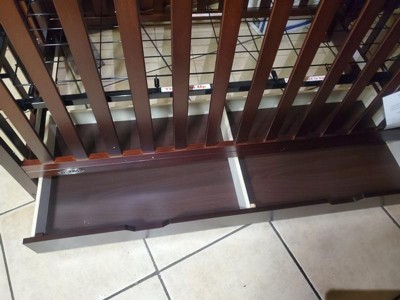 [This review was collected as part of a promotion.] This is a GORGEOUS color, and is easy to put together! It's made so well, and the drawer underneath is SO very convenient, you can store whatever you choose to, but I plan to use it for the extra diapers, wipes, bedding, etc! The slats are far enough apart that I do not have any concerns about my baby being in it. 🤎
