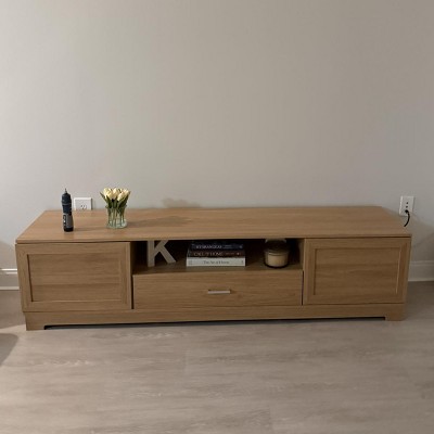 Elevate your entertainment space with this charming rustic media console, designed to support large screens up to 80 inches. Its generous top surface not only provides a secure spot for your TV but also offers plenty of room for sound systems, decorative accents, and gaming gear. Stay organized with multiple storage options, including 2 spacious cabinets, an open compartment for devices, a convenient drawer, and a back cable hole that keeps cords neatly hidden. Built with reinforced legs, this sturdy TV cabinet delivers exceptional stability, ensuring your electronics stay firmly in place.