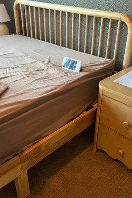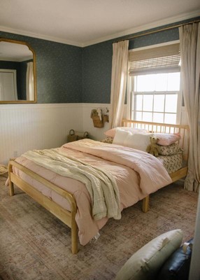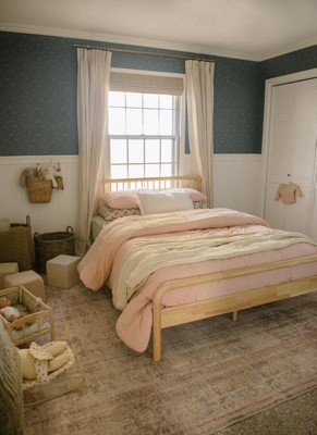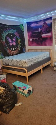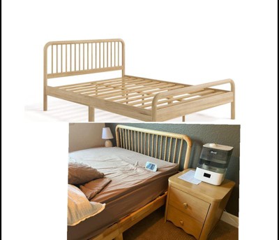 The bed frame doesn’t look as nice as it does online. It’s not a soft white wood, it definitely is on the red/orange side. And though wood is never the same, you can expect patches of different colors instead of a solid long piece of frame. It makes it look like a mountain lodge bed instead of a soft wooden bed. My full mattress also doesn’t fit perfectly with too many gaps which makes it a little unsafe for my little one. I think for the price it just doesn’t meet the mark and if anything pick a colored option instead of wood.