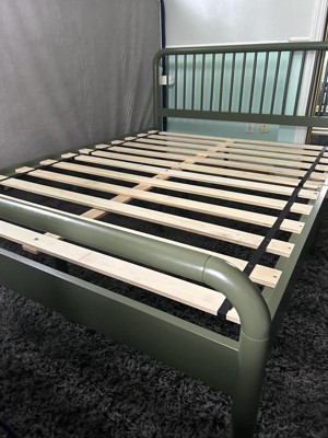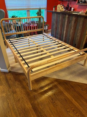 [This review was collected as part of a promotion.] Overall this seems like a well built full size bed frame that is fairly simple to assemble. It took my boyfriend about 30 minutes in total, and the instructions were easy to follow. It has a nice finish on it as well. This frame has several slats that attach to the side that support our kids memory foam mattress very well, no box spring needed. I have this bed frame sitting partially on a shag rug and partially on hardwood, which is causing the frame to flex slightly in the center, this can easily be fixed with some furniture levelers added, but keep that in mind if you are also placing in an area with the same situation.