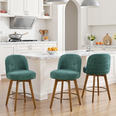 Bekrvio 27" Swivel Counter Height Bar Stools Set of 3, Fabric Upholstered Bar Chairs for Kitchen Island Walnut Wood Barstools with Open Back, Green