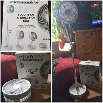[This review was collected as part of a promotion.] I love My Foldaway Fan. I received it about 1 ½ weeks ago and I’m so glad I got it. The fan has 3 speeds, can be used as a table or floor fan (as floor fan does stands at 40” tall as stated, I measured it), you can fold it up when not in use and best of all it’s rechargeable (it also works while it’s charging). I plug it in at night before going to bed to charge and in the morning it’s ready to use. I’ve tested it using the low and high speeds and in the low speed it lasted about 10-12 hrs. and on high speed about 4-5 hrs., so medium speed should be somewhere between 5-10 hrs. I cannot express how much this Foldaway Fan is a lifesaver, not sure if more so for me or my husband, going through hot flashes is no joke, ask my family. Now I have my own personal fan and am not freezing my hubby with the AC on high, he appreciates it too. I can now take my own fan with me when going out of town and not have to worry about inconveniencing anyone else. I definitely recommend the My Foldaway Fan, well worth the money. Pros: • Everything • Foldable • Table or floor fan • Rechargeable • Stand tall at 40” • 3 speeds • Long lasting charge • Portable Cons: • Would be nice in some other colors besides white.