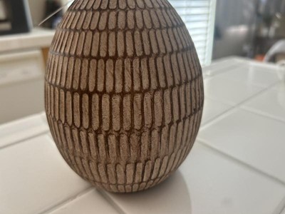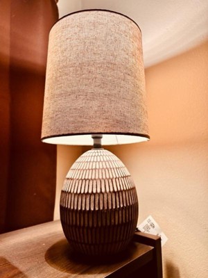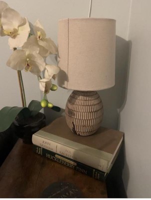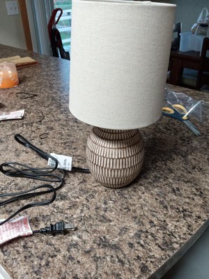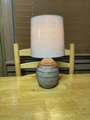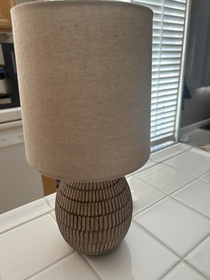 [This review was collected as part of a promotion.] This is a cute ceramic carved lamp. It is small, at a little over 12", so probably best suited for a bedroom or out of the way area. I am using this on my bedside table and it looks great! I like the design on the lamp and the neutral color (browns and beige) will match most areas. It has a beige burlap type shade. It is light and easy to move around.