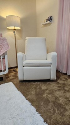 I got this chair a few weeks ago before I had my third baby and let me tell you it is worth the investment! Not only is it aesthetically beyond appealing… it is super comfortable. Now that my baby is here, we spend the majority of our day in this super cozy recliner. It glides and swivels so smoothly. The ivory color is perfect and the texture is cozy. I’ve gotten so many compliments on how beautiful and comfortable it is from family members visiting us.
