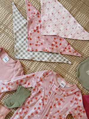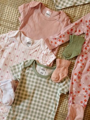- Cute Cherry Blossom Check Design: Beautiful mix of light pink cherry blossoms, soft sage gingham, and a delicate vertical floral stripe throughout the baby girl clothing sets; Feminine yet practical baby girl newborn clothes perfectly coordinated