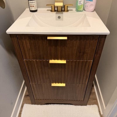I searched everywhere for the perfect vanity for our powder room and decided to take a chance on this one as I could not find any reviews online, and I’m so glad I did. It was really easy to put together, is great quality and looks very nice. Only complaint is the middle drawing doesn’t quite go fully flush when pushed in but it doesn’t bother me! For the price, this is a good buy!