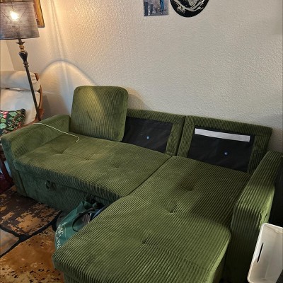 Dyonery 81" Sectional Sleeper Sofa Bed with Pull Out Bed, L-Shaped Corduroy Couch with USB Charging Ports and Storage Chaise, Emerald Green