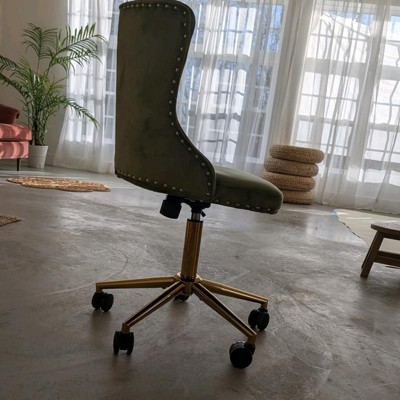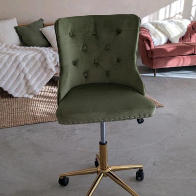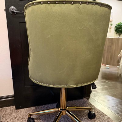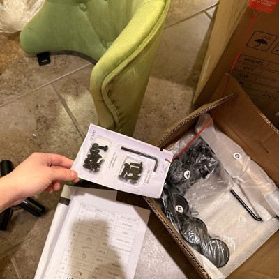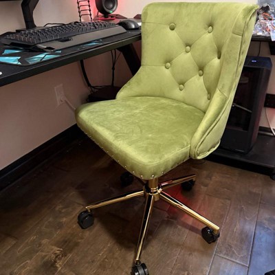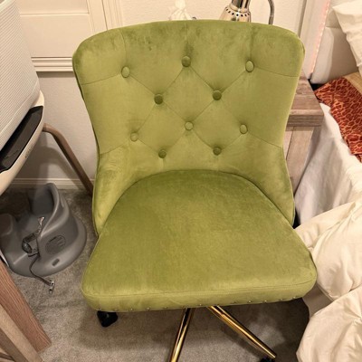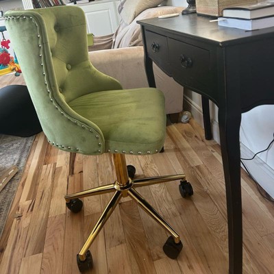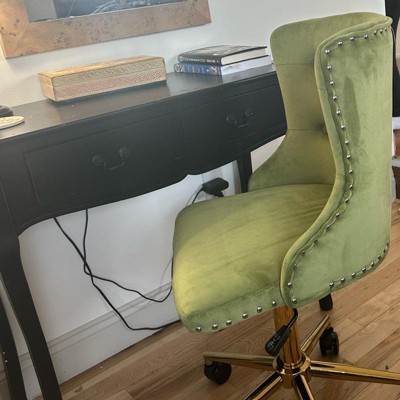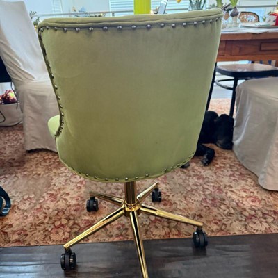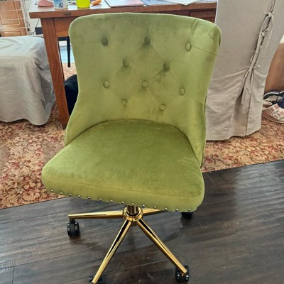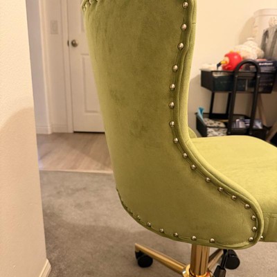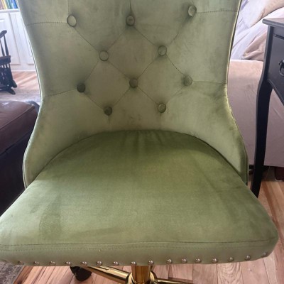 This chair was not too difficult to put together. I was able to do it myself with the tools included. It is a really soft green velvet fabric, and the base of it is a gold which is really cute. The nails around the upholstered fabric are silver however. Also it raises up pretty high and lowers down nicely and it just adds a really cute trendy look to the room.