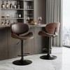 Comfort and design come together nicely in this set of two brown and black faux leather aluminum and wood adjustable height swivel bar chairs. A sleek black and brown monotone color gives this aluminum and manufactured wood and faux leather stool a fresh and updated look. The brown faux leather seat of this stool is a nice contrast to the high quality, black and brown aluminum and manufactured wood of the base. 45.67-inch h x 20.67-inch w x 20.47-inch d.
