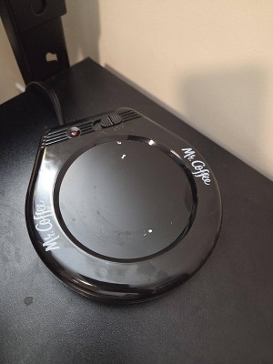 This is not my first Mr. Coffee cup warmer. I was given one as a gift several years ago and wanted to have another on hand when the first one died. Because it had worked so great for me, and I was so happy with it, I naturally purchased another one to replace it. What a disappointment. It sort of works... doesn't seem to keep the coffee as warm as the old one did. First thing that I noticed was that the "on" light doesn't work. It's in there wrong or something... you can only see it when you pick it up and look where the cord enters the plate. I can't see it when it is sitting next to me. Second, the finish on the hotplate area is wearing off just from taking the cup on and off. I never saw this on the other one. Sadly, the quality of this mug warmer is nothing near the original one I had. I am so disappointed. Photos included: (1) the surface of the hot plate; (2) the on light showing on the side where the power cord goes in; (3) the hot plate turned on - can't see light from above; (4) the hot plate turned off - light looks the same as when it is on.