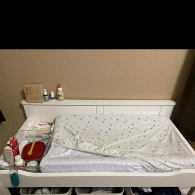 This changing pad is perfect for the changing table I bought. It’s approximately 6 inches shorter than my changing table which leaves enough room to stash my wipes and creams. It’s thick enough and water (pee) resistant. Without a cover it’s a little slippery, but nothing a towel or quick change can’t fix.