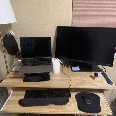 Pretty great product. I ordered this desk through the Target app and it came to my house just two days later. It took roughly 15 mins to set up and the process was fairly intuitive (note: I skipped the wall hanging step). The upper desk surface is large enough to house my laptop and 24” desktop monitor with other random items scattered about. The keyboard dock is sturdier than I anticipated. Just keep little ones off and be cognizant of how much pressure you apply - no half sits/leaning. I’m 5’9” and just over 130lbs so it’s generally fine for me but TLC is key here, I think. A few spots across both surfaces could use additional sanding but not to the point where I’m worried about splinters. Overall, I feel it’s a great value for the money and if cared for properly, a desk that’ll last you a long while. -A WFH millennial on a budget