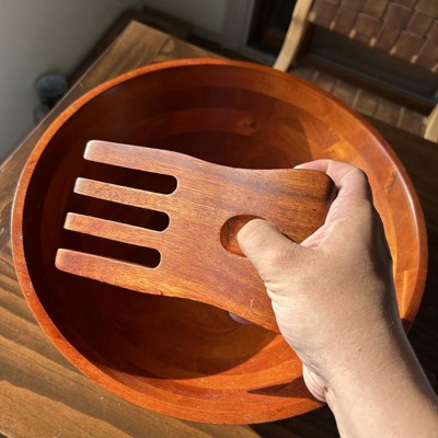 This three piece wooden bowl serving set finally arrived today after ordering almost two weeks ago. The bowl is a lot bigger than I expected it to be, but it’s great because it is the perfect salad serving bowl. The salad “hands” are very useful in helping to serve generous servings of salad, pasta, etc. The bowl and serving “hands” are made out of Asian beechwood and stained with a cherry finish. You do need to gently wash, and treat these with oil periodically; just as you would with a wooden cutting board. Overall, I am glad I purchased this, and I look forward to using this to serve food to my guests. I received an incentive to write this review.