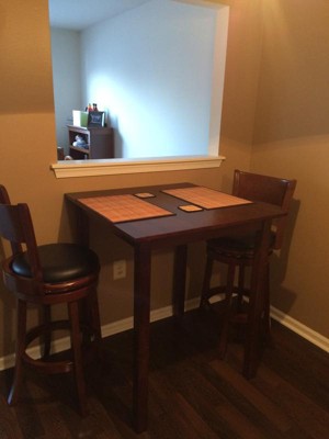 I've been on the hunt for several months looking for a nice, but inexpensive table that would suit all of my needs and finally found it! I already had stools, so I needed a table to fit their height. Also, I live in an apartment with a small dining space, so I needed it to be compact. This specs for this table fit all my needs perfectly, and when it arrived, I was even more pleased by the quality. The table is very sturdy and solid. It's big enough that I definitely think 4 people would be comfortable eating around it, although I currently have it in a corner since there are normally only 2 of us. My only complaint would be that one of the legs had a piece that was nicked off at the end. However, it was the end that screwed in under the table top, so I chose not to worry about it since it can't be seen. I'm sure I could have exchanged it without a problem, but I was so excited to get it that I didn't want to send it back!