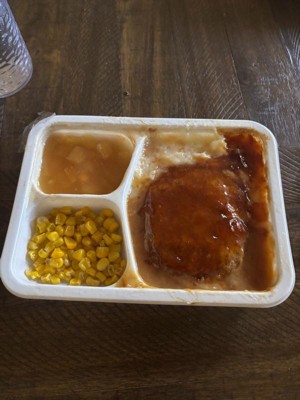 As a kid I longed for this meal it was delicious glorious it tasted like heaven for the price of the meal it was perfection then long came the horrid apple sauce it was like the friend who betrayed u now I know how ceaser must have felt to be a kid and going to the store picking up my favorite meal and seeing this horrid new thing on the box I was willing to steal get it to cook my meal to mix in the gravy with the potatoes and add corn sure it may have been a couple bites but boy was that the best part when I came home that day from school I remember looking at it seeing the apple sauce had spilled into my potatoes common problem especially with the potatoes spilling in but who wants apple sauce in ther potatoes or corn it was horrible it was stupid but little old me who longed for his glorious creation was willing to try it maybe the corn and gravy would fix it little did I know it would be the worst thing to come into my mouth at first it was glorious like beautiful rainbows and flowers all over my tongue then it turned into a horrible battle when the apple sauce had touched my tongue what was once a beautiful land on my taste buds was ravenged and left to rot in the most disgusting tasting apple sauce little me was sadden especially to see out of all the meals my store served that was the only one that had the horrible taste long apple sauce I still long for that feeling the taste and yern for the day they take it out the Salisbury steak is 8 out of 10 the gravy 9.5 out of 10 corn 10 out of 10 potatoes 10 out of 10 but when mixed in together its like it was Gordon Ramsey who created it the apple sauce single handedly ruined my favorite meal it has since been years since I have had my meal I miss you old friend hopefully one day you will return