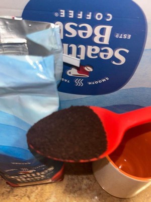[This review was collected as part of a promotion.] I like how you can tell just by the color on the package that it's from Seattle best! This is a smooth medium roast coffee which is nice and doesn't have a gritty taste to the grounds. Just take a scoop or two and add it to your maker for easy coffee making. This bag will last a while if your not drinking more than a cup a day.