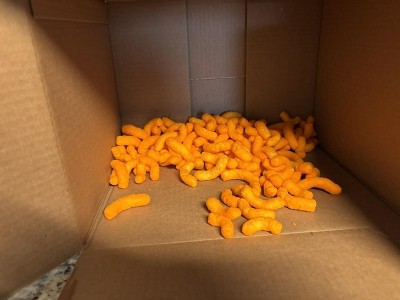 Large box arrived. Cheeto Bags were open and chips crushed and all over. Cannot even eat….please replace.