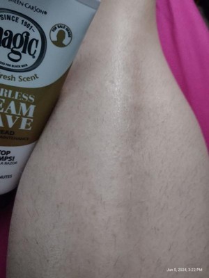 [This review was collected as part of a promotion.] SoftSheen-Carson Magic Razorless Cream Shave is a shaving cream that is formulated to help stop razor bumps and give a closer shave than a razor. It works in four minutes and lasts for four days. Pros Specifically formulated for stubborn hair and bumps Able to be used on your face, legs and heads for bald people Works quickly Cons May not be suitable for sensitive skin Unpleasant scent