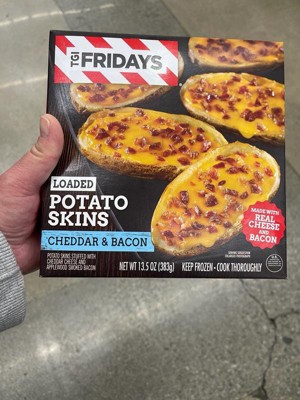 - One 13.5 oz box of TGI Fridays Frozen Appetizers Loaded Cheddar & Bacon Potato Skins, containing about 4.5 servings