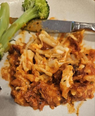 [This review was collected as part of a promotion.] The filling was 3 meats .. sause is basic tomato base. It’s seasoned well easy meal regular pasta taste not frozen.. cheese melted easy.. texture was normal not gummy.. overall good quality and easy meal