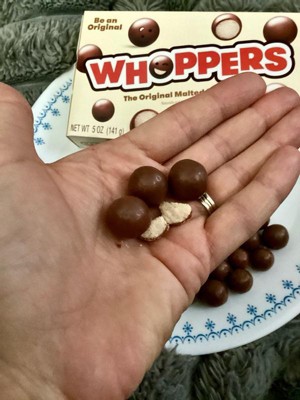 Whoppers are so yummy. I'm not a big chocolate lover but I can tolerate a thin layer. These are perfect for me with the malted milk center. I can get a whole box in minutes.