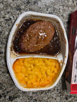 [This review was collected as part of a promotion.] This tv dinner was delish. The macaroni and cheese was really creamy and cheesy. The Salisbury steak was a perfect match with the Mac and cheese. I heated it up in the microwave it only took 5 1/2 mins. Very convenient and quick for those busy nights