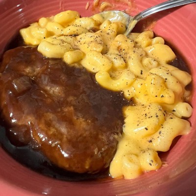[This review was collected as part of a promotion.] Came out of the microwave in 5 1/2 minutes cooked completely through and steaming hot! The Mac and cheese was creamy and cheesy. You could definitely smell and taste the 100% beef patty. Th onions in the gravy shown through beautifully in the flavor. It was really good especially for a microwave meal. For 340 calories, it was quite filling.