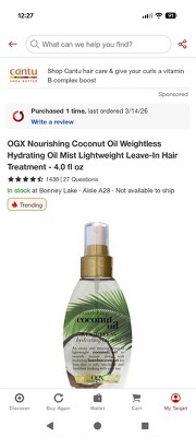 OGX Nourishing Coconut Oil Weightless Hydrating Oil Mist Lightweight Leave-In Hair Treatment - 4.0 fl oz