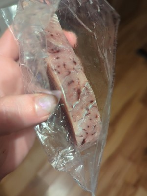 it’s brown, fishy, chewy, and disgusting. save your coins and get their awesome chipotle salmon instead. still frozen but pre-seasoned and delicious every time.